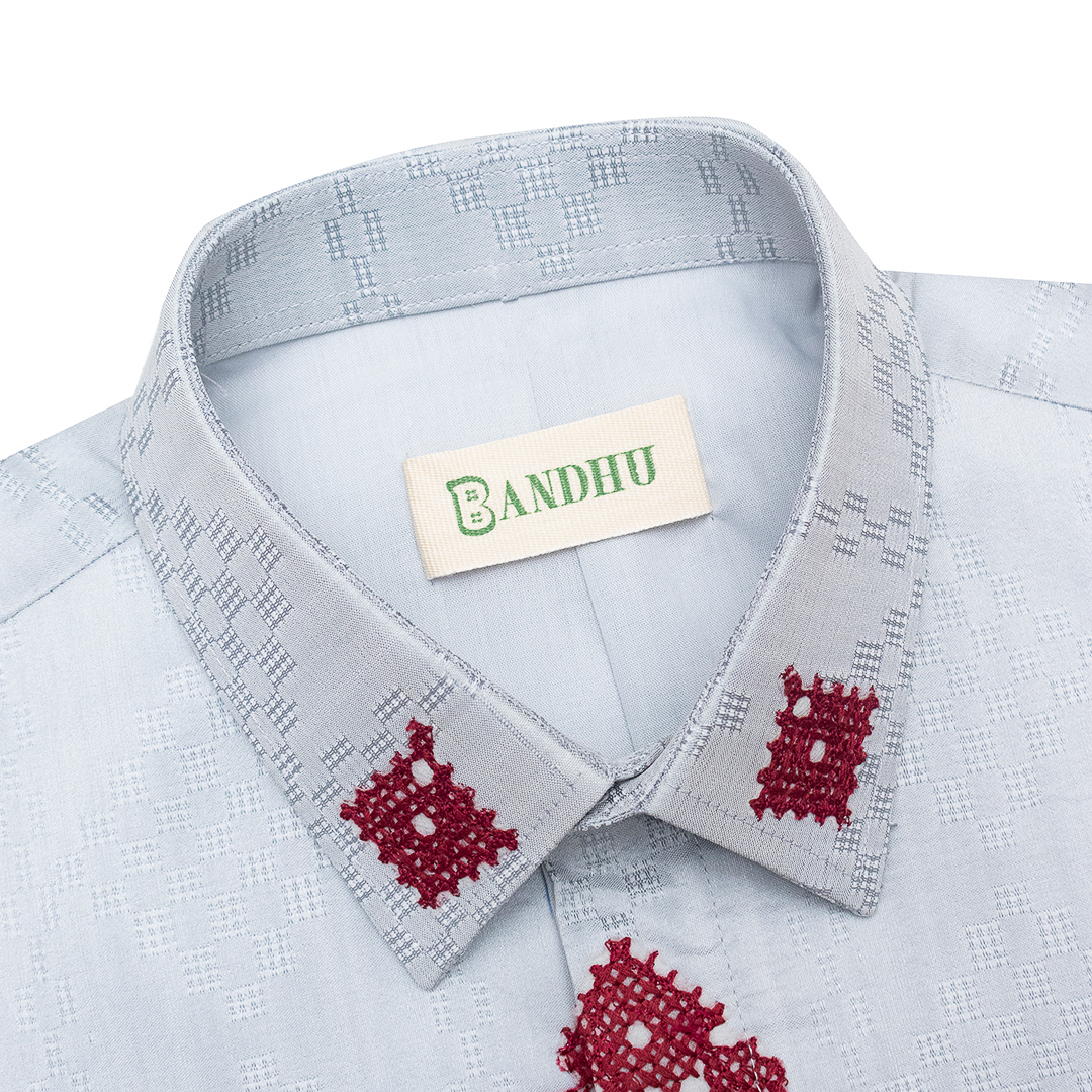 This shirt is crafted using traditional weaving techniques with a Non-Machine Loom (ATBM), combining cotton and polyester fabrics.